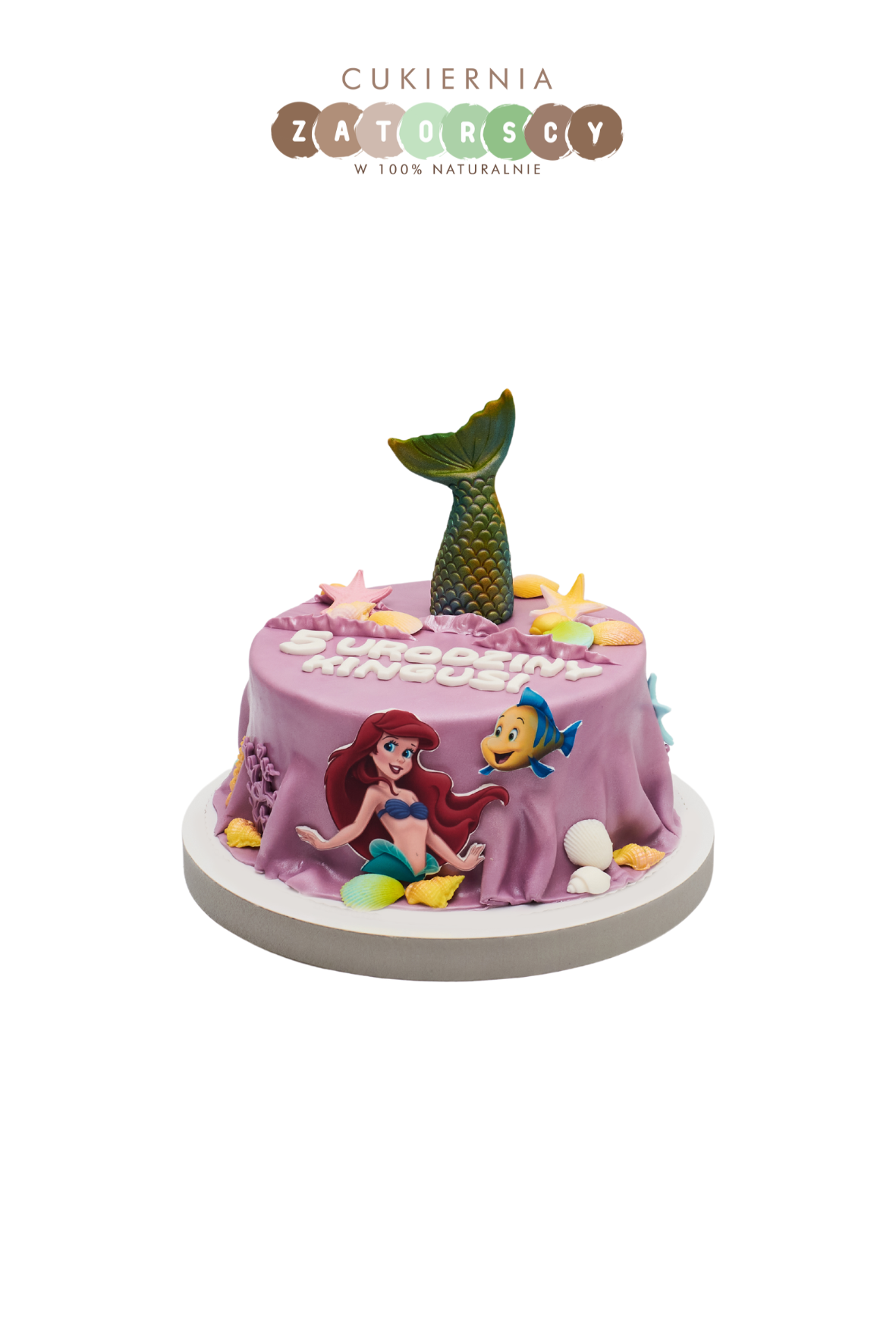 Tort dla dzieci dla dziewczynki z Arielką ogonem syrenki, morski bajkowy. Dostępny na zamówienie z możliwością personalizacji wielkości oraz smaku tortu (do wyboru z listy w karcie produktu). Szczegółowy opis smaków można znaleźć poniżej.