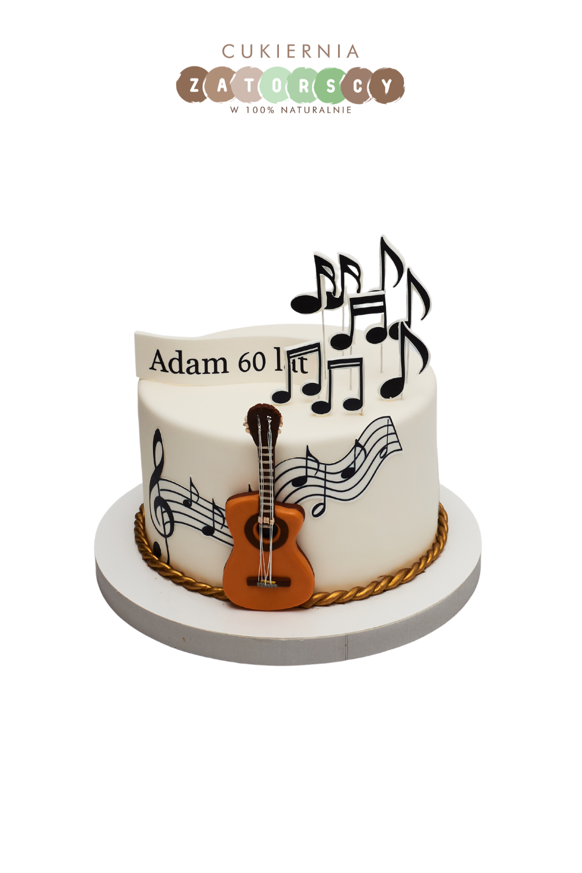 Tort w masie plastycznej z nutkami i gitarą. Dostępny na zamówienie z możliwością personalizacji wielkości oraz smaku tortu (do wyboru z listy w karcie produktu). Szczegółowy opis smaków można znaleźć poniżej.