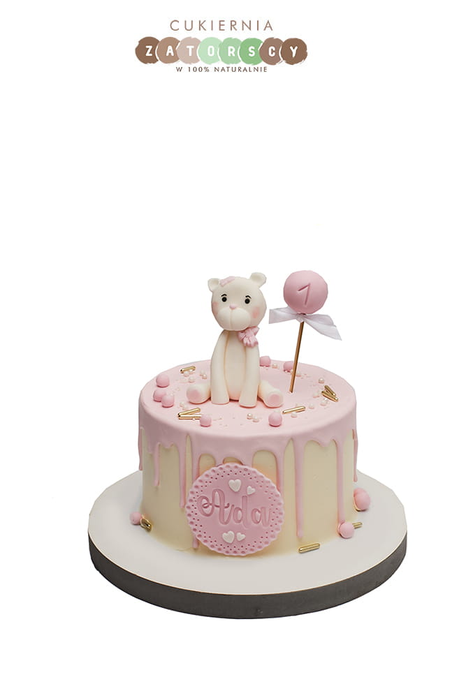 Tort na roczek dla dziewczynki w kremie drip cake. Dostępny na zamówienie z możliwością personalizacji wielkości oraz smaku tortu (do wyboru z listy w karcie produktu). Szczegółowy opis smaków można znaleźć poniżej.