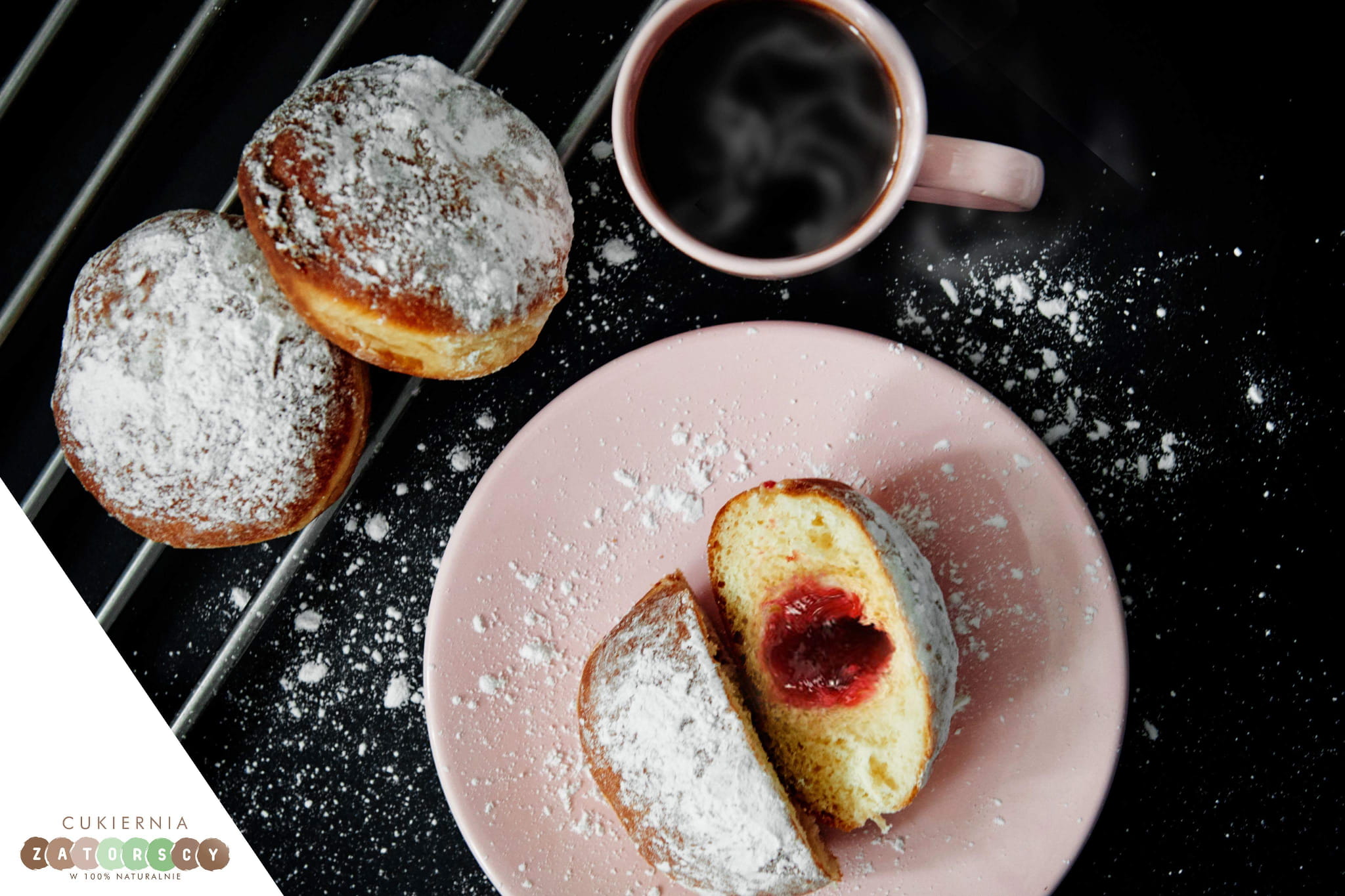 Pyszny tradycyjny pączek z nadzieniem różanym oraz lukrem.
