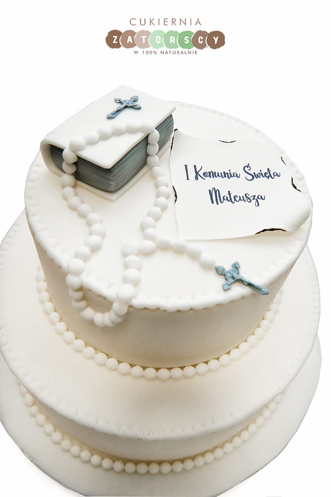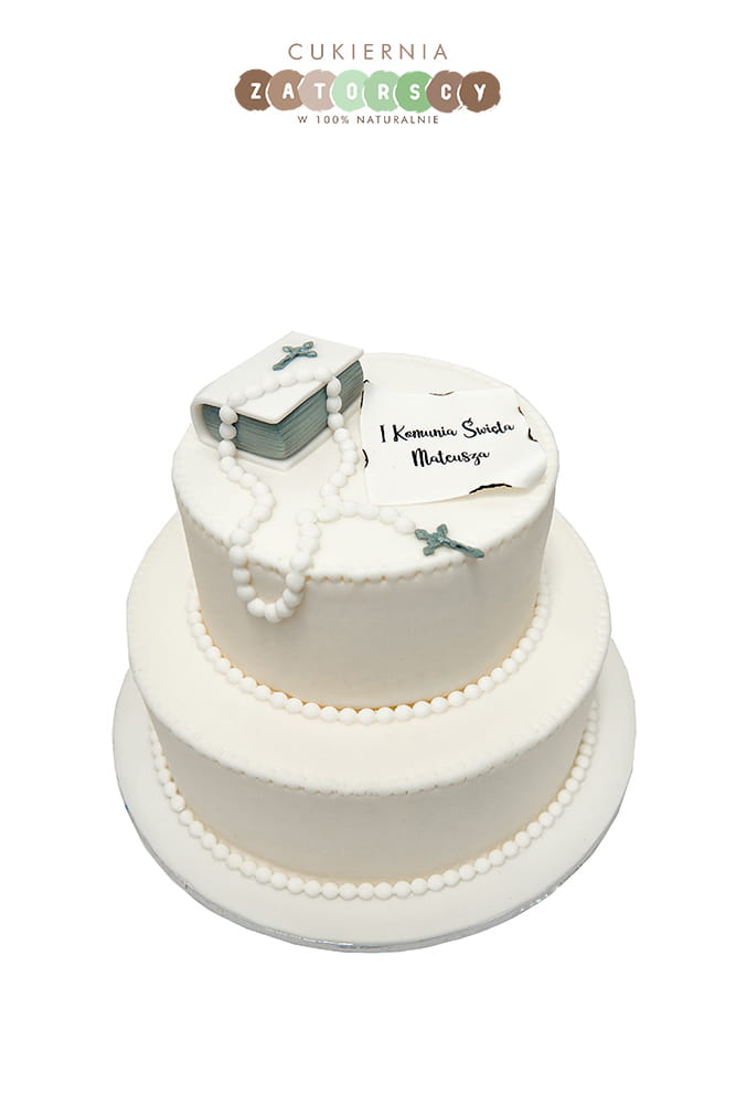Tort komunijny dwupiętrowy z książeczką i różańcem . Dostępny na zamówienie z możliwością personalizacji wielkości oraz smaku tortu (do wyboru z listy w karcie produktu). Szczegółowy opis smaków można znaleźć poniżej.