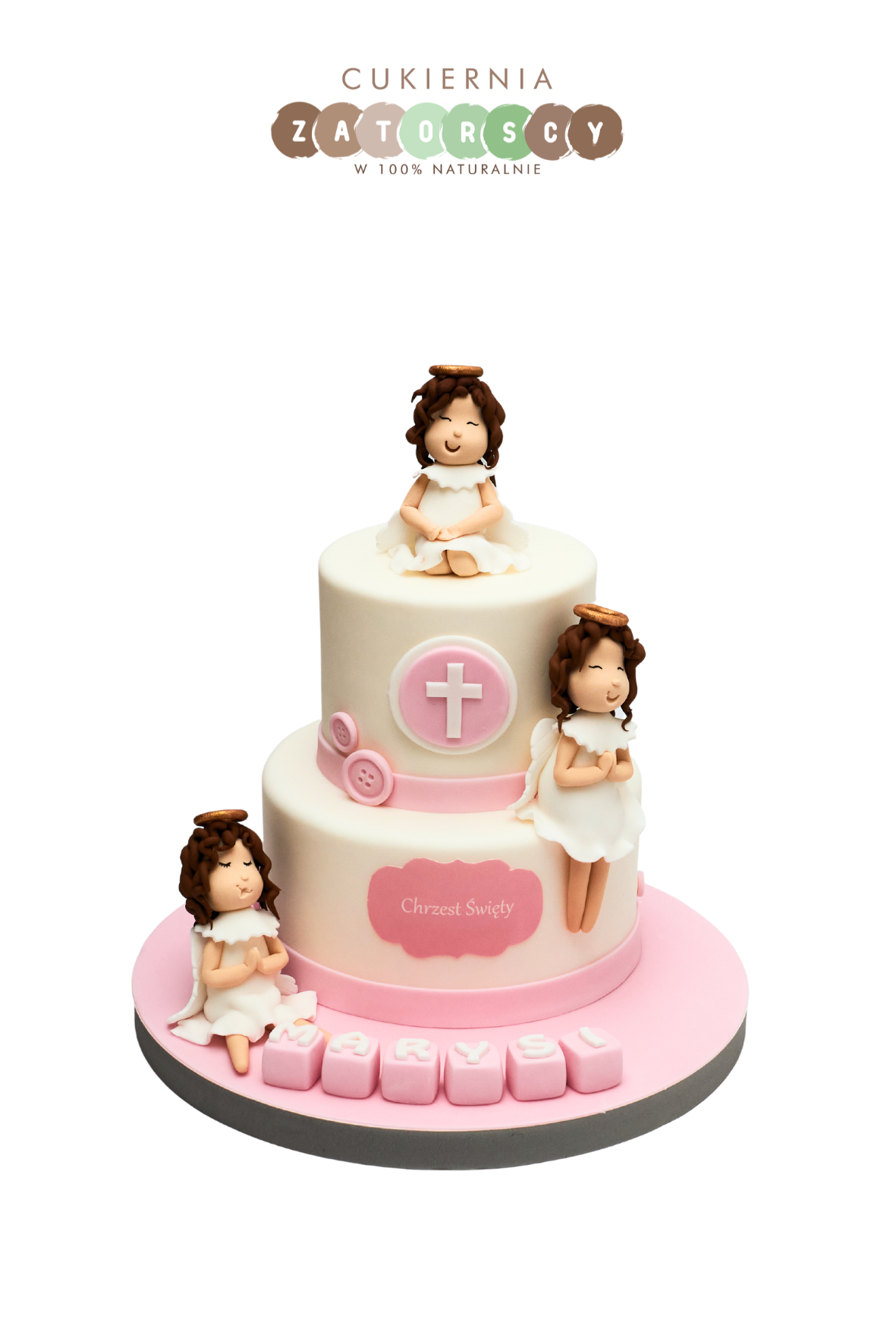 Tort na chrzest dla dziewczynki z 3 aniołami. Dostępny na zamówienie z możliwością personalizacji wielkości oraz smaku tortu (do wyboru z listy w karcie produktu). Szczegółowy opis smaków można znaleźć poniżej.