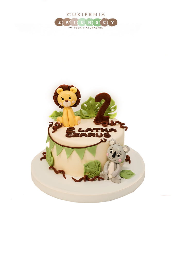 Tort dla dzieci ze zwierzętami w masie plastycznej z figurkami tygrys i miś koala, dostępny na zamówienie z możliwością personalizacji wielkości oraz smaku tortu (do wyboru z listy w karcie produktu). Szczegółowy opis smaków można znaleźć poniżej.