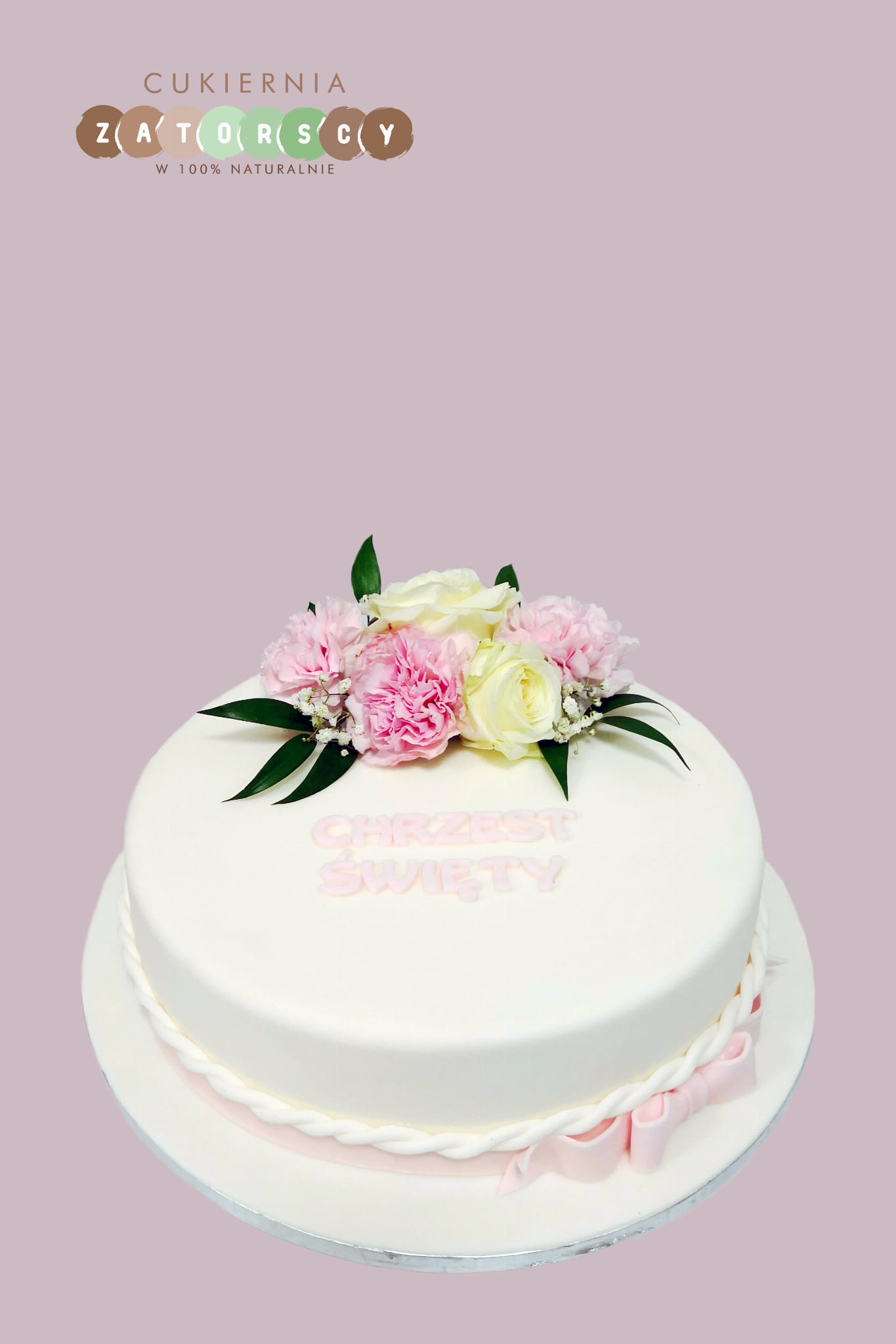 Tort na chrzest z prawdziwymi kwiatami. Dostępny na zamówienie z możliwością personalizacji wielkości oraz smaku tortu (do wyboru z listy w karcie produktu). Szczegółowy opis smaków można znaleźć poniżej.