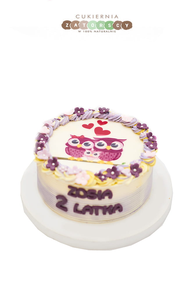 Tort dla dzieci z opłatkiem z Sowami. Dostępny na zamówienie z możliwością personalizacji wielkości oraz smaku tortu (do wyboru z listy w karcie produktu). Szczegółowy opis smaków można znaleźć poniżej.