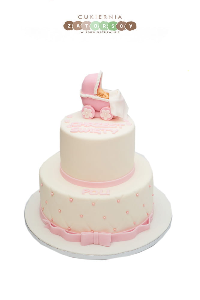 Tort na chrzest z wózkiem i dzidziusiem dla dziewczynki dwupiętrowy. Dostępny na zamówienie z możliwością personalizacji wielkości oraz smaku tortu (do wyboru z listy w karcie produktu). Szczegółowy opis smaków można znaleźć poniżej.