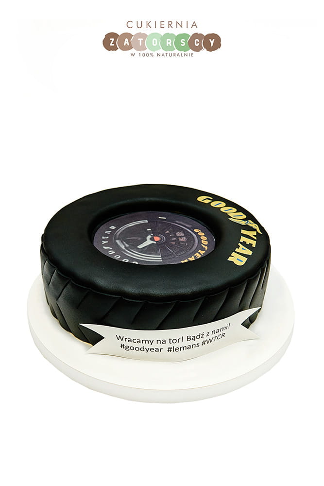 Tort okolicznościowy w kształcie opony tort 3d. Dostępny na zamówienie z możliwością personalizacji wielkości oraz smaku tortu (do wyboru z listy w karcie produktu). Szczegółowy opis smaków można znaleźć poniżej.