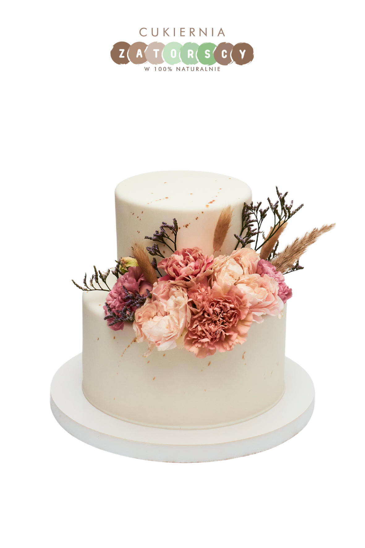 Tort klasyczny z żywymi kwiatami (kwiaty w zależności od dostępności) dwupiętrowy. Tort w masie plastycznej. Dostępny na zamówienie z możliwością personalizacji wielkości oraz smaku tortu (do wyboru z listy w karcie produktu). Szczegółowy opis smaków można znaleźć poniżej.